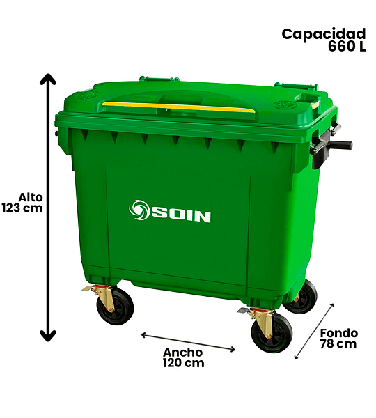 ¿Necesitas un contenedor para almacenar grandes cantidades de basura? Los contenedores de basura de 660 Litros de Soin, están fabricados en HPDE, un material resistente a diferentes condiciones ambientales, golpes y raspaduras, nuestros basureros industriales permiten una correcta gestión de residuos, están disponibles en diferentes colores, verde para reciclar envases de vidrio, amarillo para reciclar envases plásticos, azul para reciclar papel y cartón y gris para eliminar residuos procedentes de la basura doméstica. Utilízalos en zonas con alto flujo de residuos como industrias, comercios, sector de la salud, educación, condominios, gastronómico. ¡Cómpralo en Technostore y obtén un basurero de calidad industrial con despacho sin costo en Santiago!