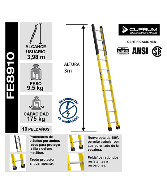 ¿Buscas una escalera para realizar trabajos en cámaras subterráneas? La escalera de fibra de vidrio para cámaras de 10 peldaños Cuprum, es la opción perfecta para trabajos en altura que requieren resistencia a la corrosión, alcance y seguridad, la escalera dieléctrica de 10 peldaños es certificada, esto quiere decir que cumple con todos los requerimientos de calidad y pruebas de resistencia de acuerdo a las normas ANSI, CSA y OSHA, tiene una capacidad máxima de carga de 175 kilos, es extremadamente duradera y resistente a los golpes y caídas. Incluye peldaños en forma de "D" que permite una gran estabilidad, ¡Cómprala online y simplifica tus labores en altura de manera confiable y segura!